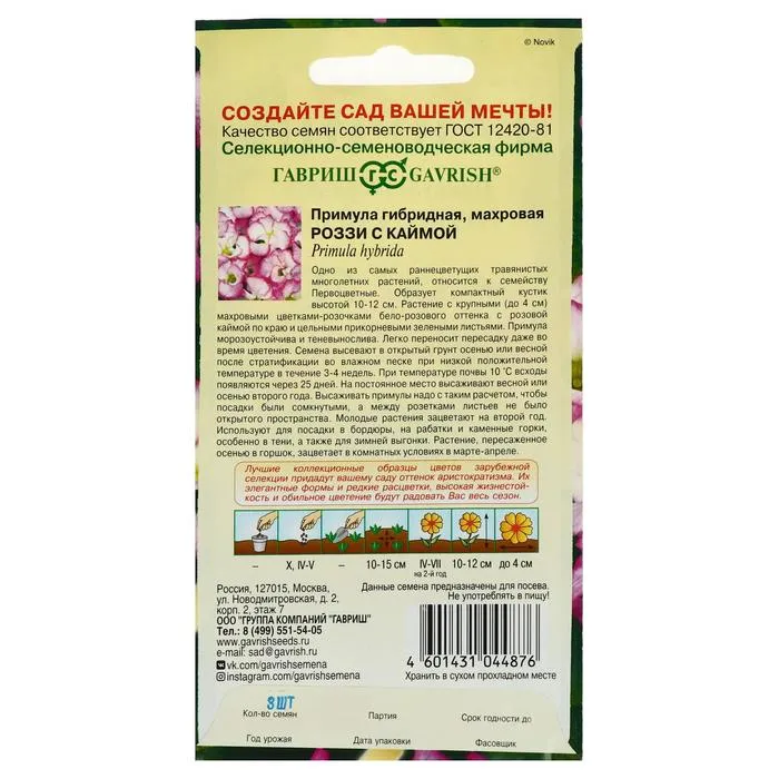 Одно из самых раннецветущих травянистых многолетних растений, относится к семейству Первоцветные. Образует компактный и очень выровненный кустик высотой 10-12 см. Растение с крупными (до 4 см), махровыми цветками-розочками бело-розового оттенка с темно-розовой каймой по краю и цельными прикорневыми зелеными листьями. Примула морозоустойчива и теневынослива. Легко переносит пересадку даже во время цветения. Семена высевают в открытый грунт осенью или весной после стратификации во влажном песке при низкой положительной температуре, в течение 3-4 недель. При температуре почвы 10°С всходы появляются через 25 дней.