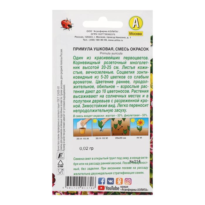 Семена цветов Примула "Ушковая", смесь окрасок, Мн, 0,02 г — Характеристики