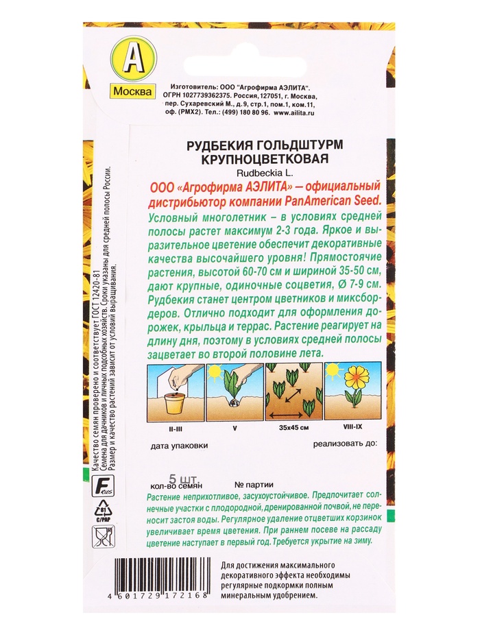 Семена цветов Рудбекия Гольдштурм крупноцветковая Мн Спецсерия PanAmerican, Ц/П,5 шт. — Характеристики