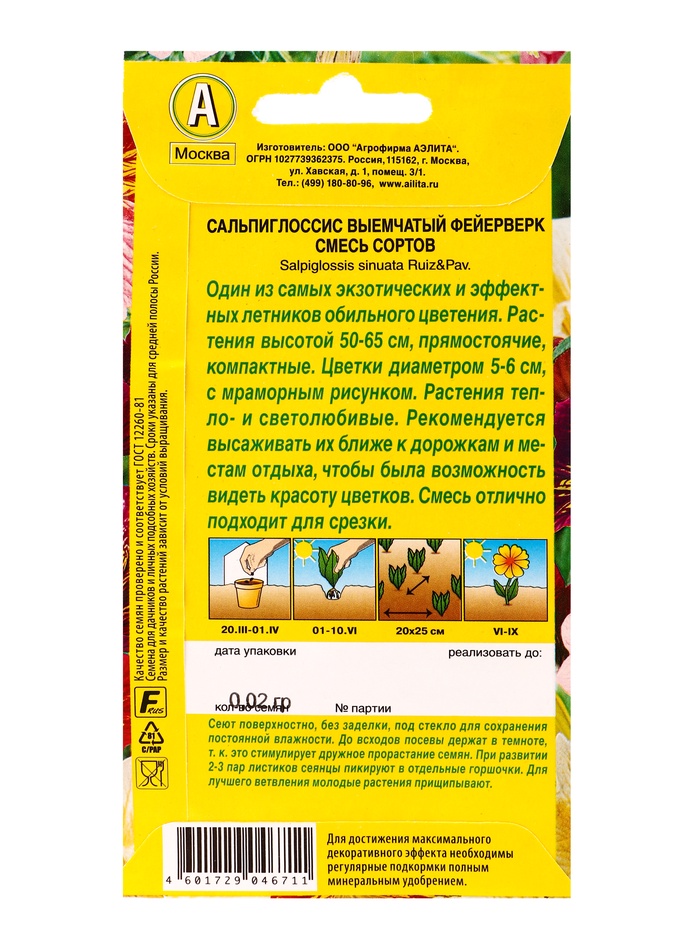 Семена цветов Сальпиглоссис Фейерверк, смесь сортов , Ц/П,0,02 г — Характеристики