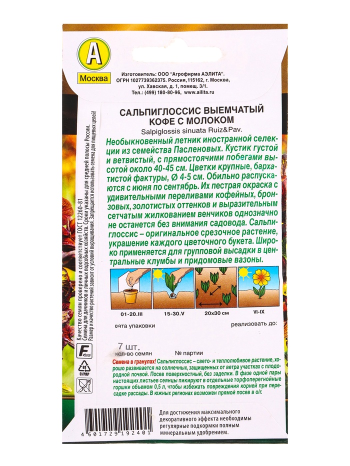 Семена цветов Сальпиглоссис Кофе с молоком (драже в пробирке) Золотая серия, Ц/П,7 шт. — Характеристики