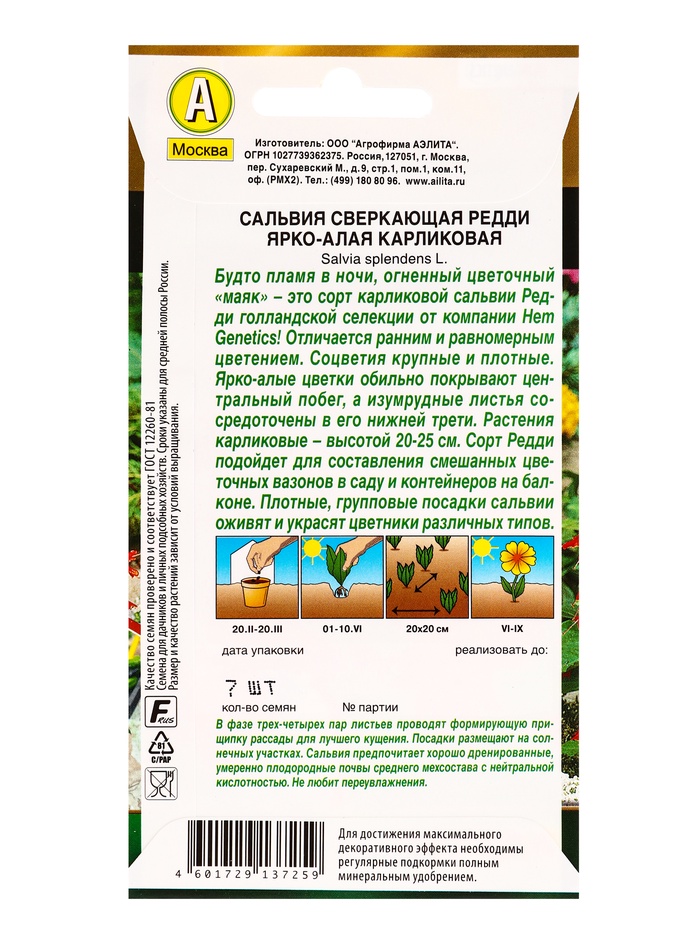 Семена цветов Сальвия Редди ярко-алая карликовая С. Hem Genetics Золотая серия, Ц/П,7 шт. — Характеристики