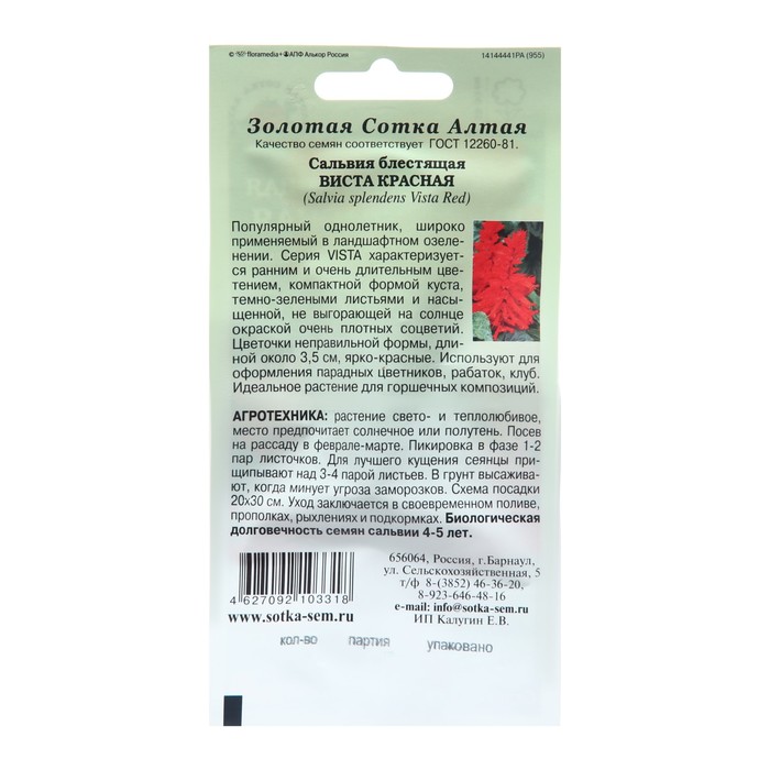 Семена цветов Сальвия "Виста Красная", 10 шт — Характеристики