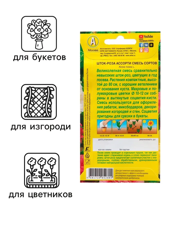 «Ассорти» — смесь окрасок сравнительно невысоких шток-роз, которые цветут в год посева. Растение формирует махровые и полумахровые цветки, собранные в вытянутые соцветия-кисти, которые пригодны для срезки в букеты.