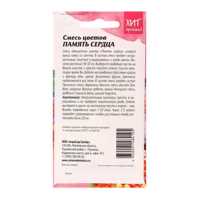 Смесь однолетних цветов Память сердца создаст яркий ковер из цветов. В состав смеси входят неприхотливые, простые в выращивании и уходе цветы. Высота растений 40-50 см. Выберите свободное место на Вашем участке и просто посейте семена. Спустя некоторое время Вы будете наслаждаться буйством красок и фактур, одни цветы дополняют другие. Цветение продолжается все лето. В состав смеси входят: астра Принцесса смесь, бархатцы Бонита смесь, василек Блю болл, георгина Веселые ребята, левкой Империал смесь, рудбекия Глориоза дейзи, цинния Карусель. Агротехника: Неприхотливые культуры, просты в выращивании и не требуют тщательного ухода. Семена высевают в грунт на постоянное место в апреле – мае. Всходы появляются через 7-10 дней. Через 2 – 3 недели проводят прореживание, чтобы расстояние между растениями было 20 см. Штрих-код - 4650091484195
