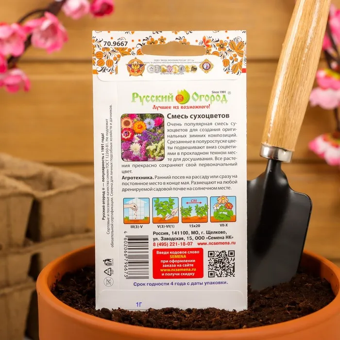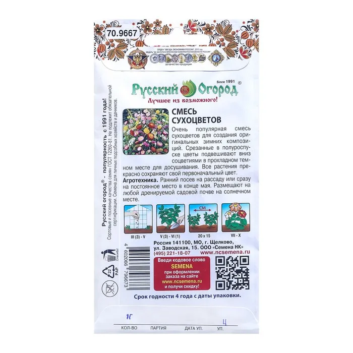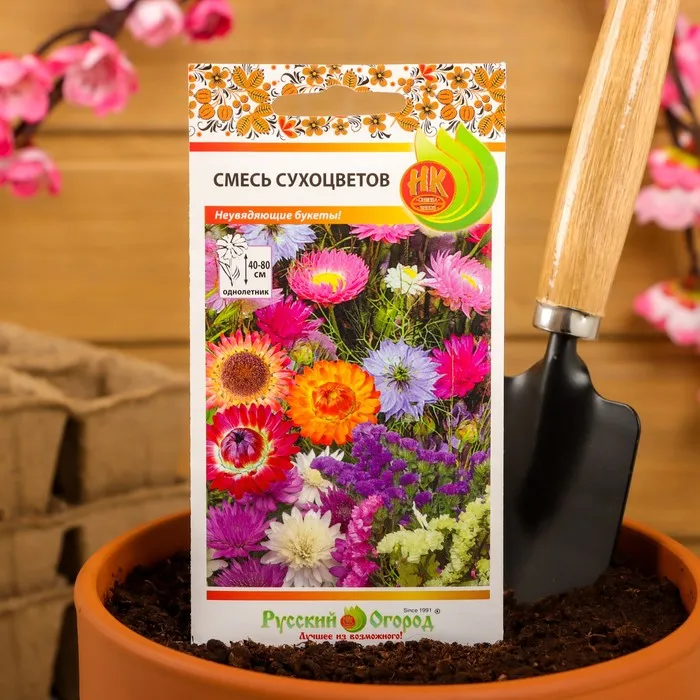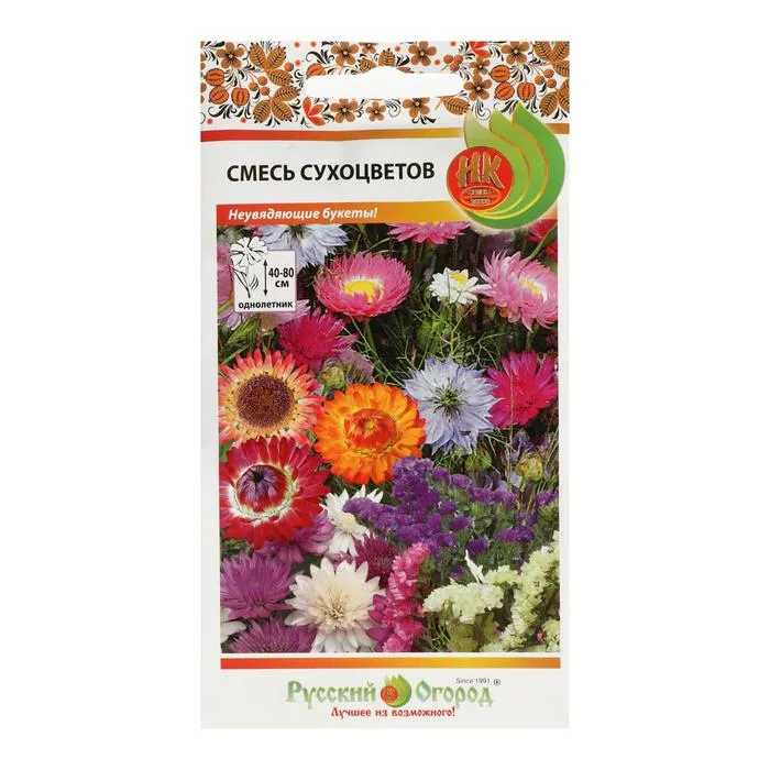 Очень популярная смесь сухоцветов для создания оригинальных зимних композиций. Срезанные в полуроспуске цветы подвешивают вниз соцветиями в прохладном темном месте для досушивания. Все растения прекрасно сохраняют свой первоначальный цвет.