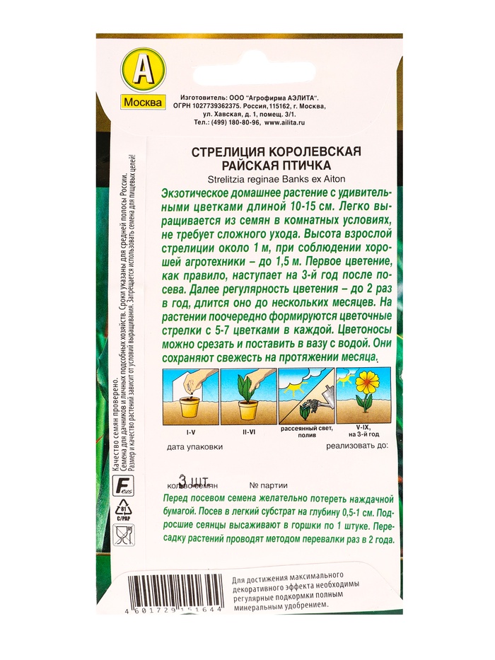 Семена цветов Стрелиция королевская Райская птичка Мн Золотая серия, Ц/П,3 шт. — Характеристики