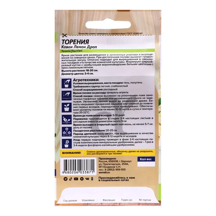 Эффектный и необычный однолетник с сочной и пышной листвой, формирует шарообразный кустик высотой 20 см. Удивительное, хорошо выравненное миниатюрное растение с цветками необычной формы, имеющими необычную окраску. Венчик цветка нежно-белый с выраженным ярко-лимонным пятном. Замечательно смотрится в небольших контейнерах и композициях с другими цветами, используется как горшечное, клумбовое растение. Может выращиваться в качестве комнатного растения как многолетник. Любит яркий рассеянный свет и защищённое от ветра и дождя теплое место.