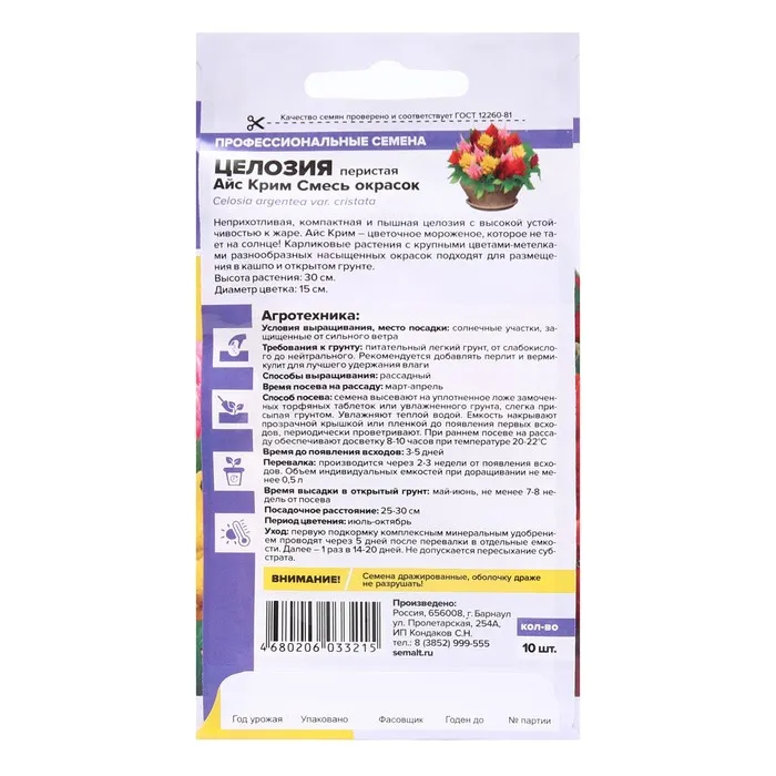 Очаровательное однолетнее карликовое растение высотой до 30 см. Серия отличается выравненностью растений, коротким периодом выращивания и широкой цветовой палитрой.Компактные растения увенчаныметельчатыми густомахровыми соцветиями красной, оранжевой, желтой и розовой окраски. Длина соцветий составляет половину высоты растения. Диаметр соцветий – 10-15 см. Выращивают целозию в групповых и одиночных посадках, а так же в горшках для украшения террас, балконов. Свето- и теплолюбивое растение. Наибольшей декоративности достигает на солнечных, защищенных от ветра участках с легкой плодородной почвой, не выносит кислых почв. Семена на рассаду высевают в марте-начале апреля. Ёмкость заполняют субстратом, состоящим из вермикулита и перегнойной земли (1:1). Семена равномерно (не густо) распределяют по поверхности почвосмеси, не заделывая, а лишь слегка вдавливая в нее. Для получения наилучшего результата посев рекомендуем проводить в торфяные таблетки (одно драже в таблетку). Посевы увлажняют из распылителя, накрывают стеклом или пленкой и помещают на хорошо освещенный теплый (+23-25оС) подоконник, защитив от прямых солнечных лучей. Посевы нужно ежедневно проветривать и следить за влажностью почвы. Всходы появляютсячерез 6-8 дней, их продолжают выращивать при температуре +17-20оС. В условиях короткого светового дня растениям требуется дополнительная подсветка в течение 4-6 часов. За период выращивания производят 2 пикировки: одну после появления у сеянцев нескольких листочков, вторую – в середине мая в горшки диаметром 7 см. В открытый грунт рассаду высаживают в конце мая – начале июня, когда минует угроза заморозков. Посадочный интервал – 15-20 см. Внимание! Семена дражированные - оболочку драже не разрушать!