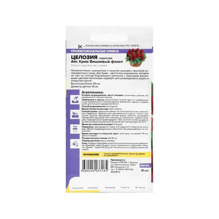 Очаровательное однолетнее карликовое растение высотой до 30 см. Серия отличается выравненностью растений, коротким периодом выращивания и широкой цветовой палитрой. Компактные кустики увенчаныметельчатыми густомахровыми соцветиями сочной вишневой окраски, длина которых составляет половину высоты растения. Диаметр соцветий – 10-15 см. Выращивают целозию в групповых и одиночных посадках, а так же в горшках для украшения террас, балконов. Свето- и теплолюбивое растение. Наибольшей декоративности достигает на солнечных, защищенных от ветра участках с легкой плодородной почвой, не выносит кислых почв. Семена на рассаду высевают в марте-начале апреля. Ёмкость заполняют субстратом, состоящим из вермикулита и перегнойной земли (1:1). Семена равномерно (не густо) распределяют по поверхности почвосмеси, не заделывая, а лишь слегка вдавливая в нее. Для получения наилучшего результата посев рекомендуем проводить в торфяные таблетки (одно драже в таблетку). Посевы увлажняют из распылителя, накрывают стеклом или пленкой и помещают на хорошо освещенный теплый (+23-25оС) подоконник, защитив от прямых солнечных лучей. Посевы нужно ежедневно проветривать и следить за влажностью почвы. Всходы появляютсячерез 6-8 дней, их продолжают выращивать при температуре +17-20оС. В условиях короткого светового дня растениям требуется дополнительная подсветка в течение 4-6 часов. За период выращивания производят 2 пикировки: одну после появления у сеянцев нескольких листочков, вторую – в середине мая в горшки диаметром 7 см. В открытый грунт рассаду высаживают в конце мая – начале июня, когда минует угроза заморозков. Посадочный интервал – 15-20 см. Внимание! Семена дражированные - оболочку драже не разрушать!