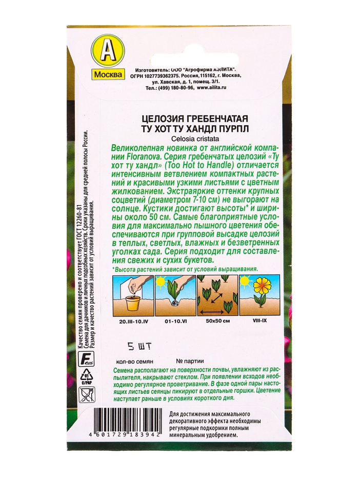 Семена цветов Целозия гребенчатая Ту хот ту хандл пурпл С. Floranova Золотая серия, Ц/П,5 шт. 10945 — Характеристики