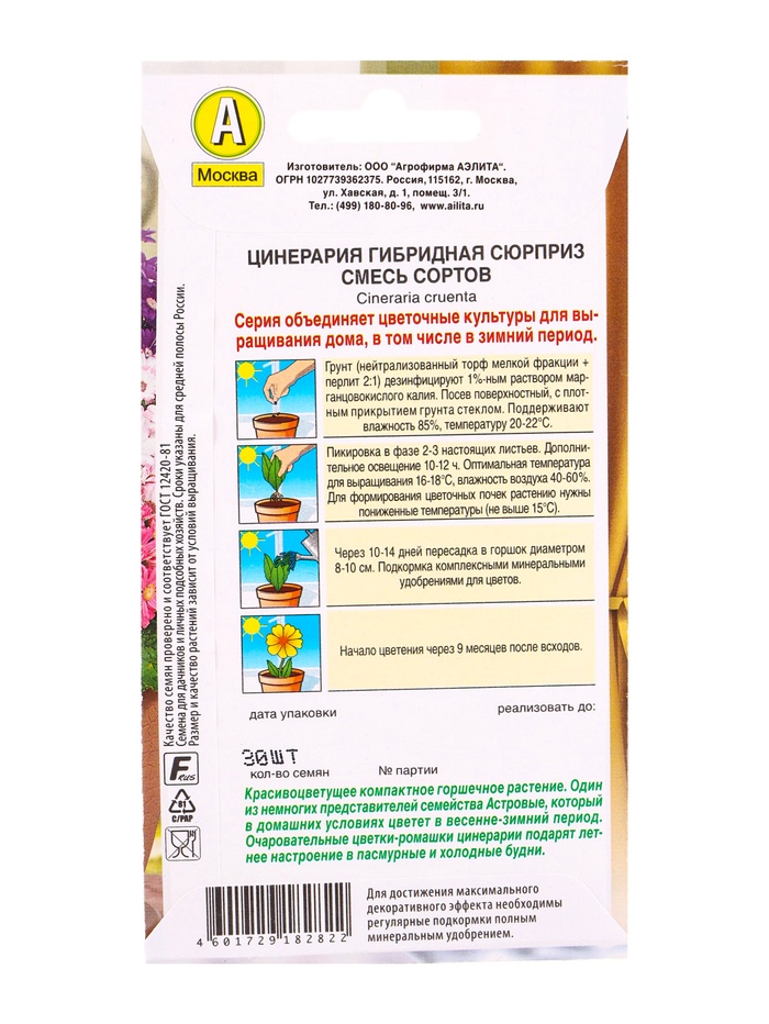Семена цветов Цинерария гибридная Сюрприз, смесь сортов Мн Зимний сад, Ц/П,30 шт. — Характеристики