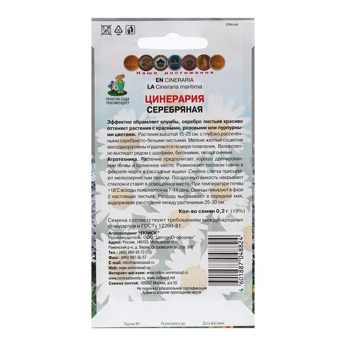 Эффектно обрамляет клумбы, серебро листьев красиво оттеняет растения с красными, розовыми или пурпурными цветами. Растение высотой 15-25 см с глубоко рассеченными серебристо-белыми листьями. Мелкие желтые соцветия малодекоративны и удаляются по мере появления. Великолепно выглядит рядом с шалфеем, бегониями, пеларгониями. Агротехника. Растение предпочитает хорошо дренированные почвы и солнечное место. Размножают посевом семян в феврале - марте в рассадные ящики. Семена слегка присыпают мелкозернистым песком. Посадочную емкость накрывают стеклом и ставят в освещенное место. При температуре почвы +18 °C всходы появляются на 7-14 день. Сеянцы пикируют в фазе 2-х настоящих листьев. Рассаду высаживают в середине мая, выдерживая расстояние между растениями 25-30 см.