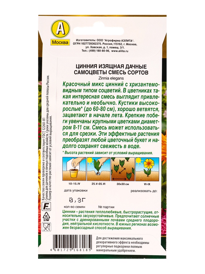 Семена цветов Цинния Дачные самоцветы, смесь сортов Золотая серия, Ц/П,0,3 г — Характеристики