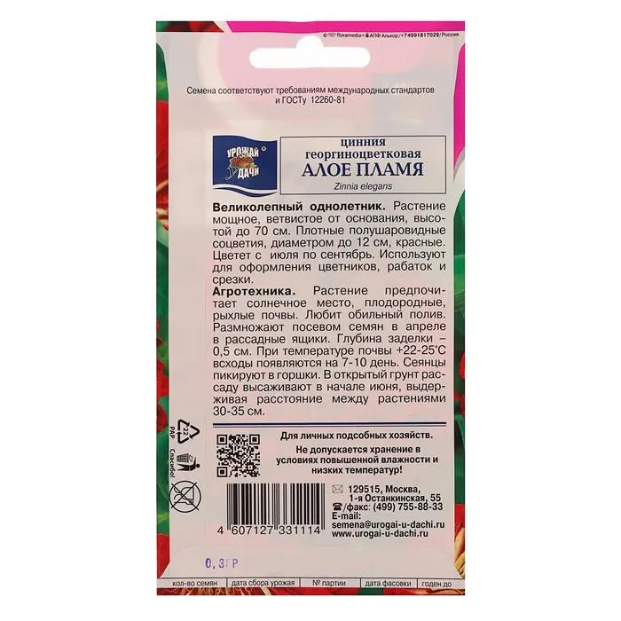 Семена цветов Цинния георгиновидная "Алое Пламя" ,0,3 г — Характеристики