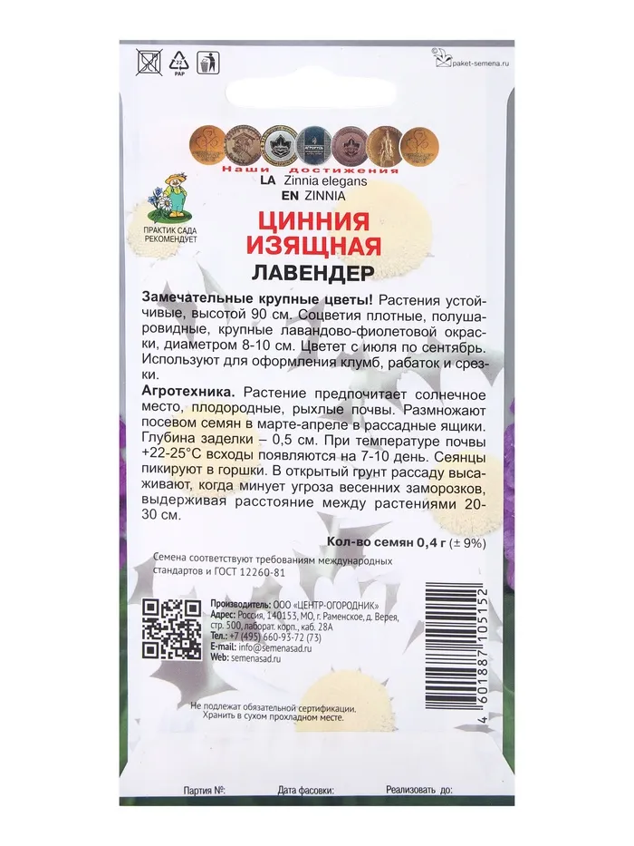 Семена цветов Цинния изящная Лавендер, 0,4гр — Характеристики