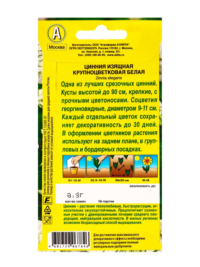 Семена цветов Цинния Крупноцветковая белая , Ц/П,0,3 г — Характеристики