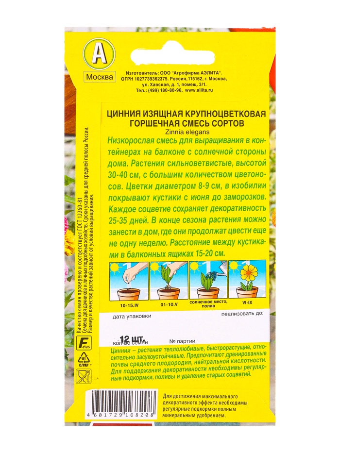 Семена цветов Цинния Крупноцветковая горшечная, смесь сортов Цветущий балкон, Ц/П,12 шт. — Характеристики