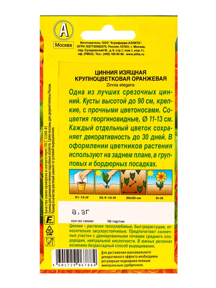 Семена цветов Цинния Крупноцветковая оранжевая , Ц/П,0,3 г — Характеристики