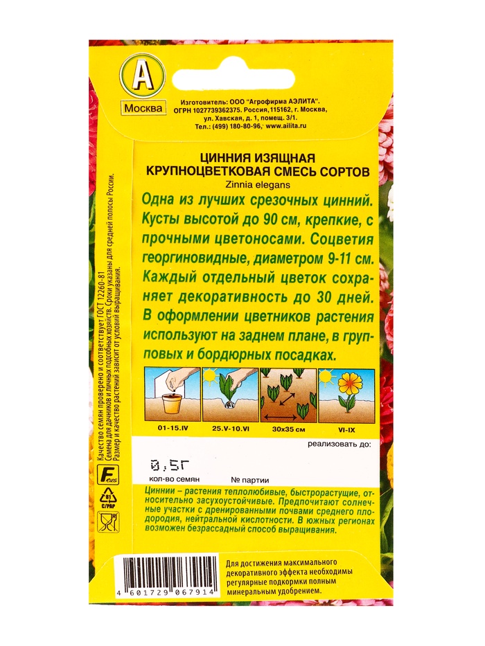 Семена цветов Цинния Крупноцветковая, смесь сортов , Ц/П,0,5 г — Характеристики