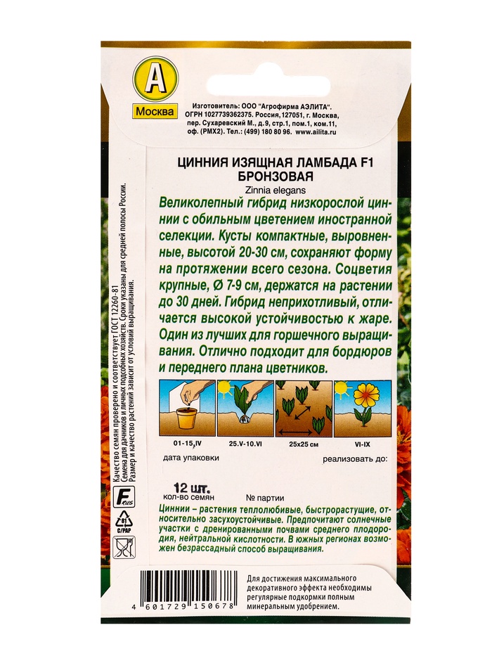 Семена цветов Цинния Ламбада F1 бронзовая Золотая серия, Ц/П,12 шт. — Характеристики