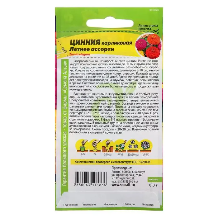 Очаровательный низкорослый сорт циннии. Растение формирует компактные кустики высотой до 30 см с крупными плотными полушаровидными соцветиями разнообразной окраски. Махровые соцветия-корзинки, диаметром 8-10 см, многочисленные полушаровидные ярких окрасок. Каждый цветок держится на растении до 35 дней. Растение прекрасно подойдет для групповых посадок на клумбах, рабатках, великолепно в срезке. Цветение обильное, с июля до октября. Удаление увядших соцветий способствует более пышному и продолжительному цветению. Растение относительно засухоустойчиво, но требует регулярных поливов, чувствительно даже к легким заморозкам. Предпочитает солнечные, защищенные от ветра теплые участки с дренированной нейтральной, богатой гумусом и минеральными элементами почвой. Посевы на рассаду проводят с конца марта под стекло. Глубина заделки семян 0,5 см. При температуре +22…+25°С всходы появляются на 7-10 день. С развитием первой пары настоящих листочков сеянцы пикируют в отдельные горшочки. В фазе 5-6 листьев проводят формирующую прищипку. В открытый грунт на постоянное место рассаду высаживают в конце мая – начале июня, когда минует угроза заморозков. Схема посадки – 20х20 см. Возможен прямой посев семян в открытый грунт в мае.