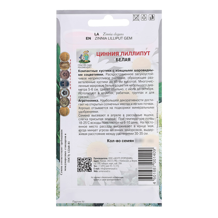 Семена Цветов Цинния «Лиллипут», белая, 0.4 г, «ПОИСК» — Характеристики