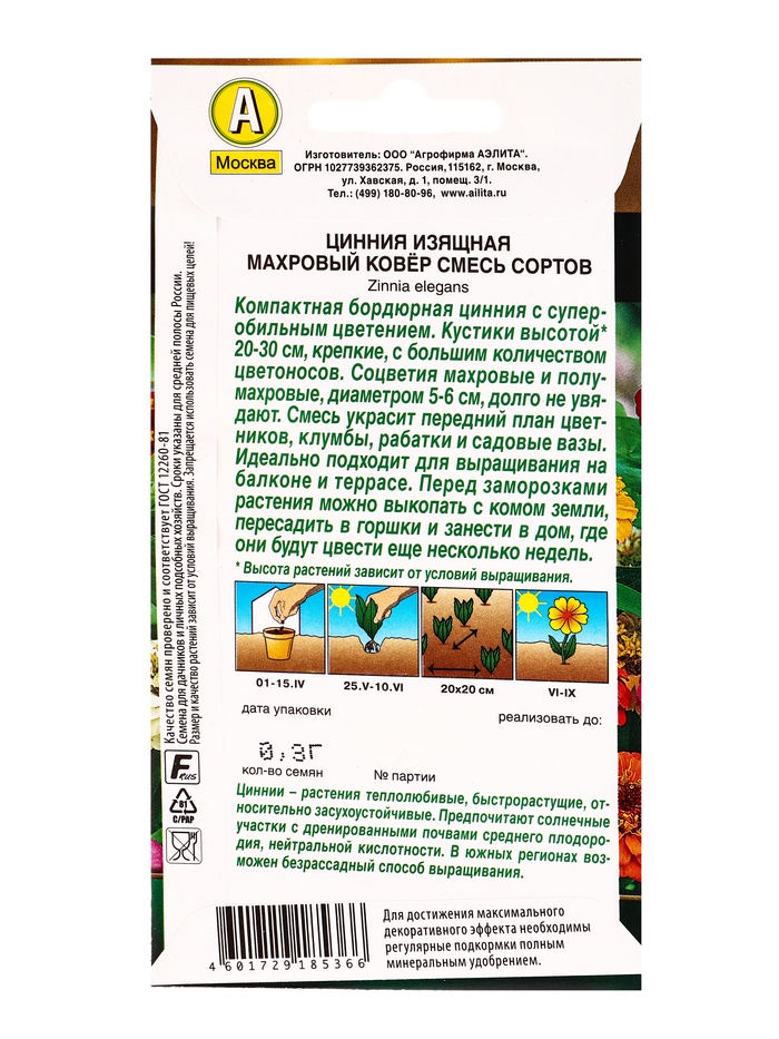 Семена цветов Цинния Махровый ковер, смесь сортов Золотая серия, Ц/П,0,3 г — Характеристики