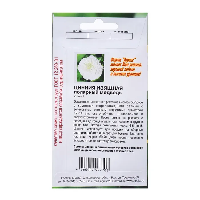 Семена цветов Цинния "Полярный медведь", 0,2-0,3 г — Характеристики