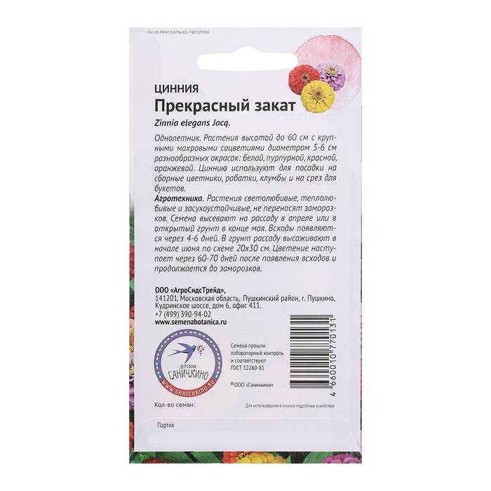 Семена Цветов Цинния «Прекрасный закат», 0.2 г, «Агросидстрейд» — Характеристики