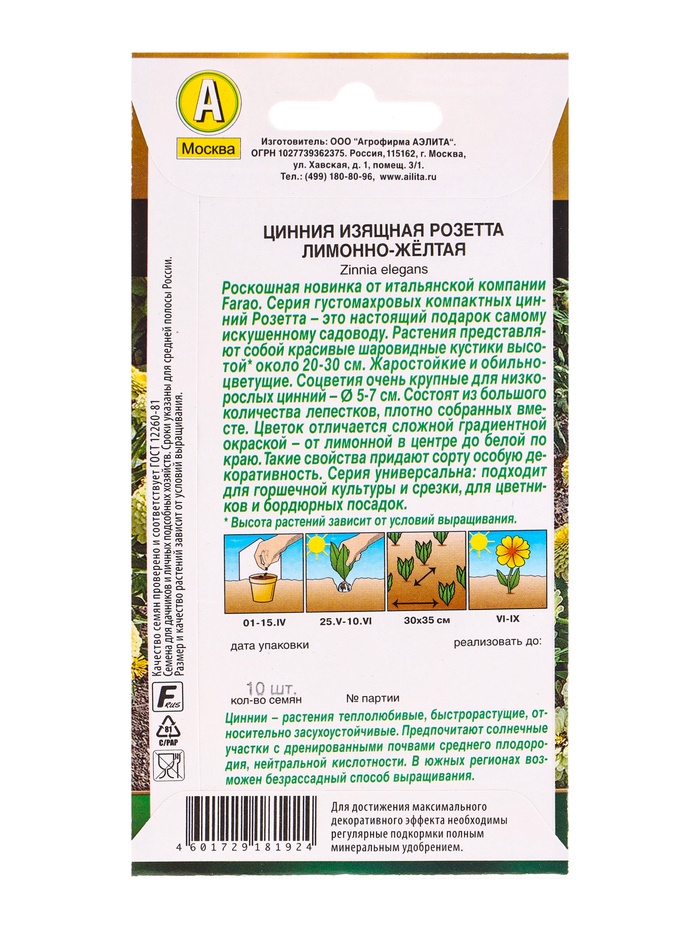 Семена цветов Цинния Розетта лимонно-желтая С. Farao Золотая серия, Ц/П,10 шт. — Характеристики