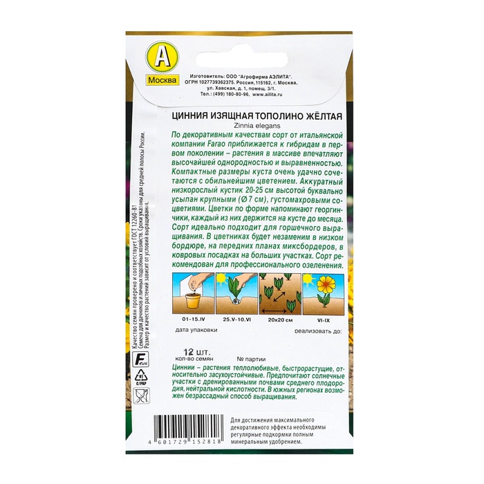 Цинния прекрасно дополняет любой цветник и клумбу благодаря своей компактной форме и насыщенному цвету. Она хорошо переносит солнечные лучи, добавляя свежести и жизнерадостности в ваш сад. Срок агрономической пригодности — 3 года, так что вы можете быть уверены в стабильности и надежности продукции.