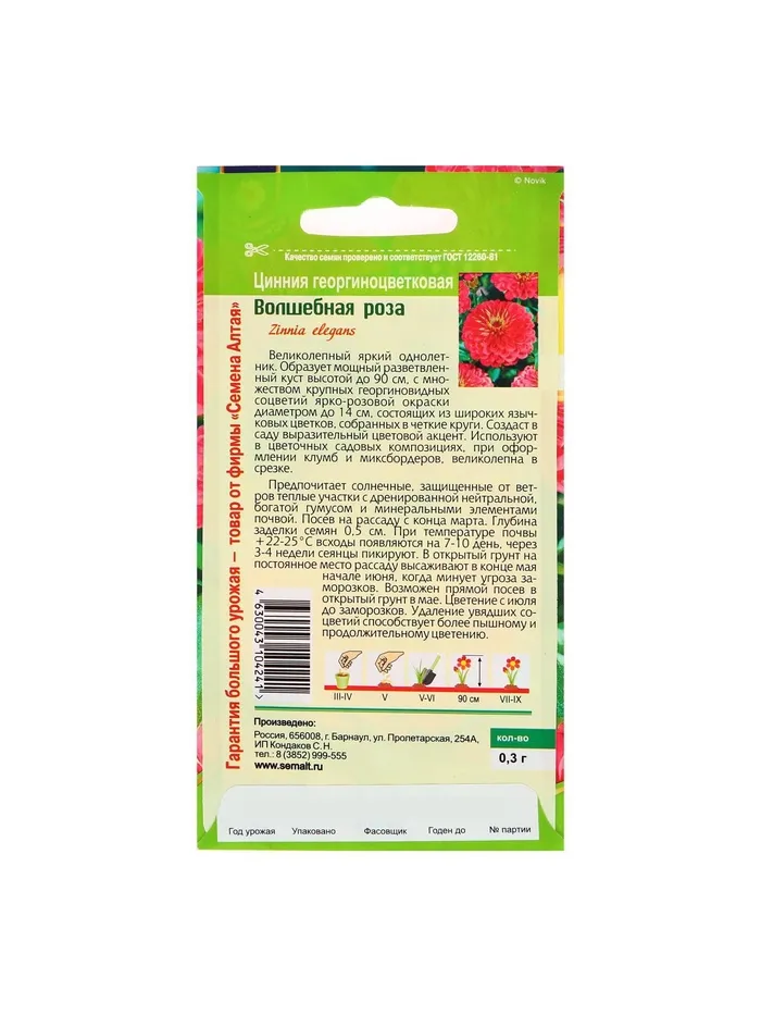 Семена цветов Цинния "Волшебная Роза", ц/п, О, ц/п, 0,3 г. — Характеристики
