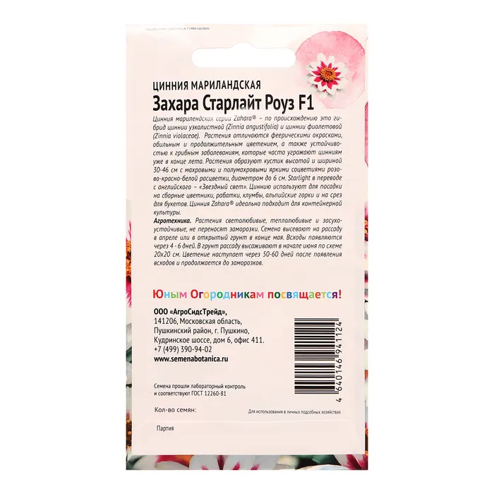 Семена цветов Цинния "Захара Стар Лайт Роуз F1", 5 шт — Характеристики