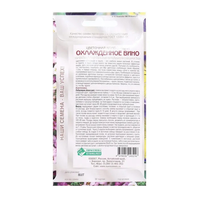 Цветочная композиция Охлажденное вино - это симбиоз живых растений. В отличие от букета, в кашпо нельзя просто так поместить рядом несколько эффектных видов: одни растения могут начать угнетать другие. Учитывая эту особенность, мы постарались подобрать для Вас цветочные комбинации таким образом, чтобы, в первую очередь, они были совместимы между собой и, конечно же, подчеркивали красоту и привлекательность друг друга. Комбинации составлены из различных цветочных культур с интересной палитрой окраски и цветового сочетания, подобные вариации в уличных вазонах смотрятся эффектно, просто и притягательно одновременно. В состав этой композиции входит Viola hybrid Sorbet F1 Midnight Glow & Lobularia maritima(Alyssum)Сlear Crystal Lavender Shades. Они мобильны и декоративны с весны до осени, а возможности использования безграничны - кашпо, вазоны, подвесные корзины, отличный вариант для контейнерного декора балконов.