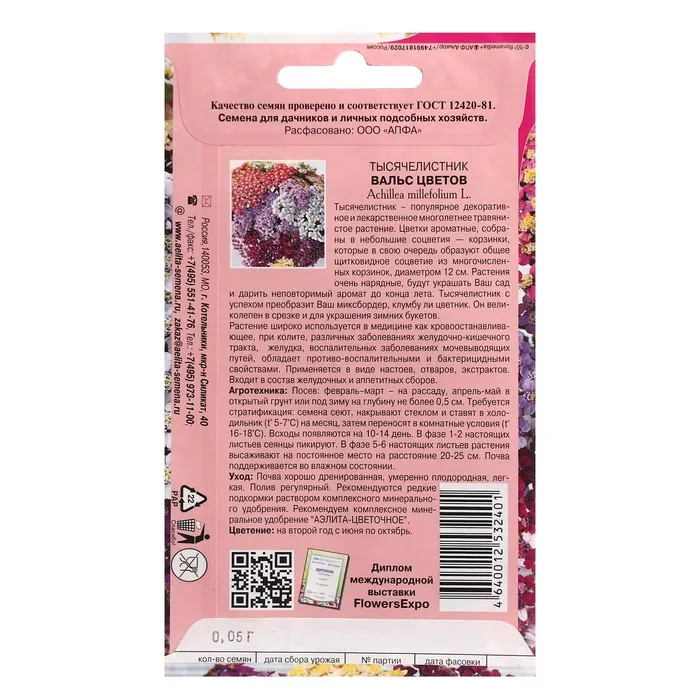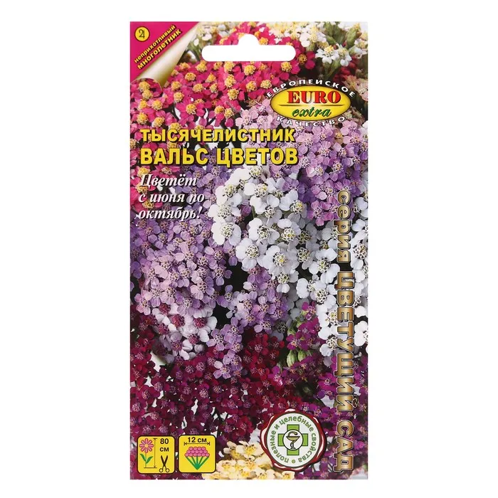 Тысячелистник - популярный многолетник, быстро и пышно разрастающийся. Высота растения 60 см. Густые щитковидные соцветия всевозможных окрасок эффектно выглядят на фоне темно-зеленых сильно рассеченных листьев.