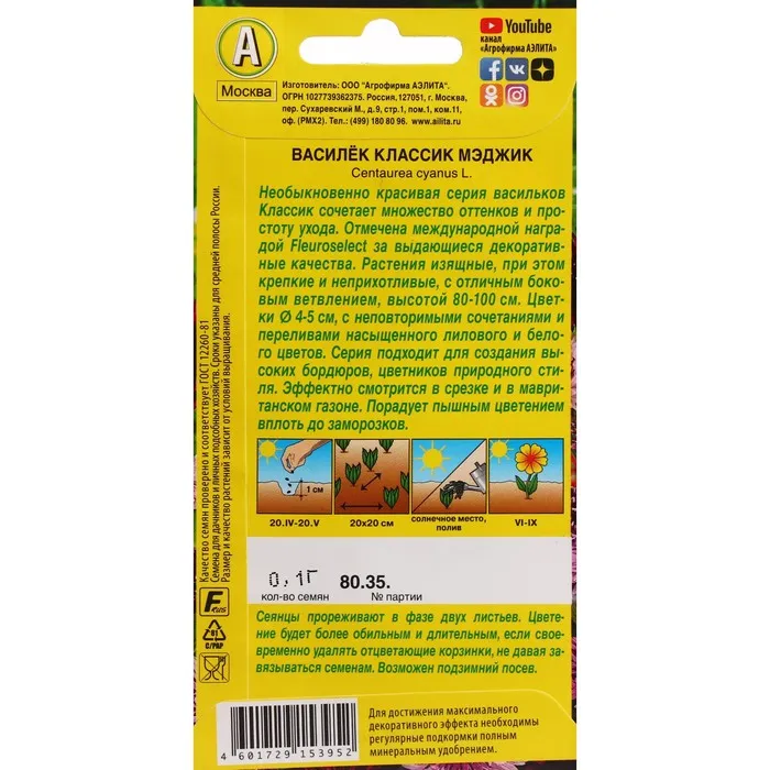 Необыкновенно красивая серия васильков сочетает множество оттенков и простоту ухода. Отмечена международной наградой Fleuroselect за выдающиеся декоративные качества. Растения изящные, при этом крепкие и неприхотливые, с отличным боковым ветвлением, высотой 80-100 см. Цветки 4-5 см, с неповторимыми сочетаниями и переливами насыщенного лилового и белого цветов. Серия подходит для создания высоких бордюров, цветников природного стиля. Эффектно смотрится в срезке и в мавританском газоне. Порадует пышным цветением вплоть до заморозков.