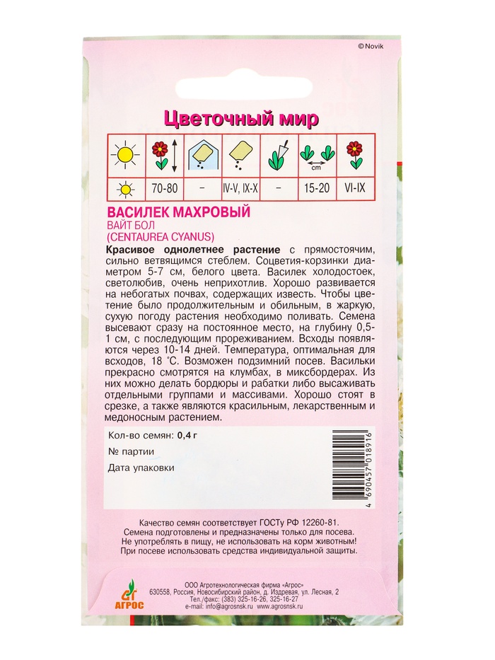 Семена цветов Василёк махровый «Вайт Бол», 0.4 г, «Агрос» — Характеристики