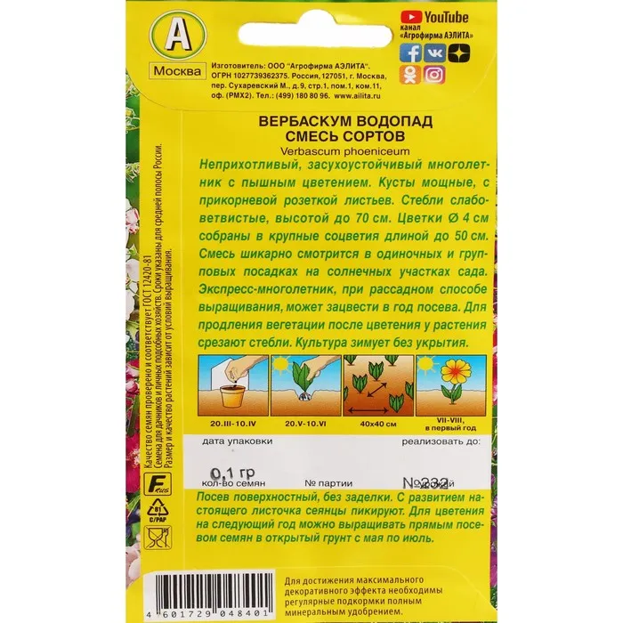 Посев поверхностный, без заделки. С развитием настоящего ли-сточка сеянцы пикируют. Рассаду высаживают на постоянное место, когда минует угроза заморозков. Можно выращивать прямым посевом семян в открытый грунт с мая по июль, для цветения на следующий год. Вербаскум хорошо растет на солнечных участках с дренированными почвами без избытка органики. В укрытии на зиму не нуждается.