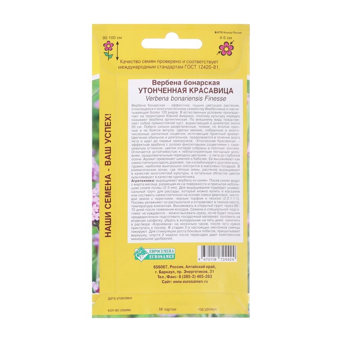 Семена Цветов Вербена бонарская «Утонченная Красавица», 5 шт., «Евросемена» — Характеристики