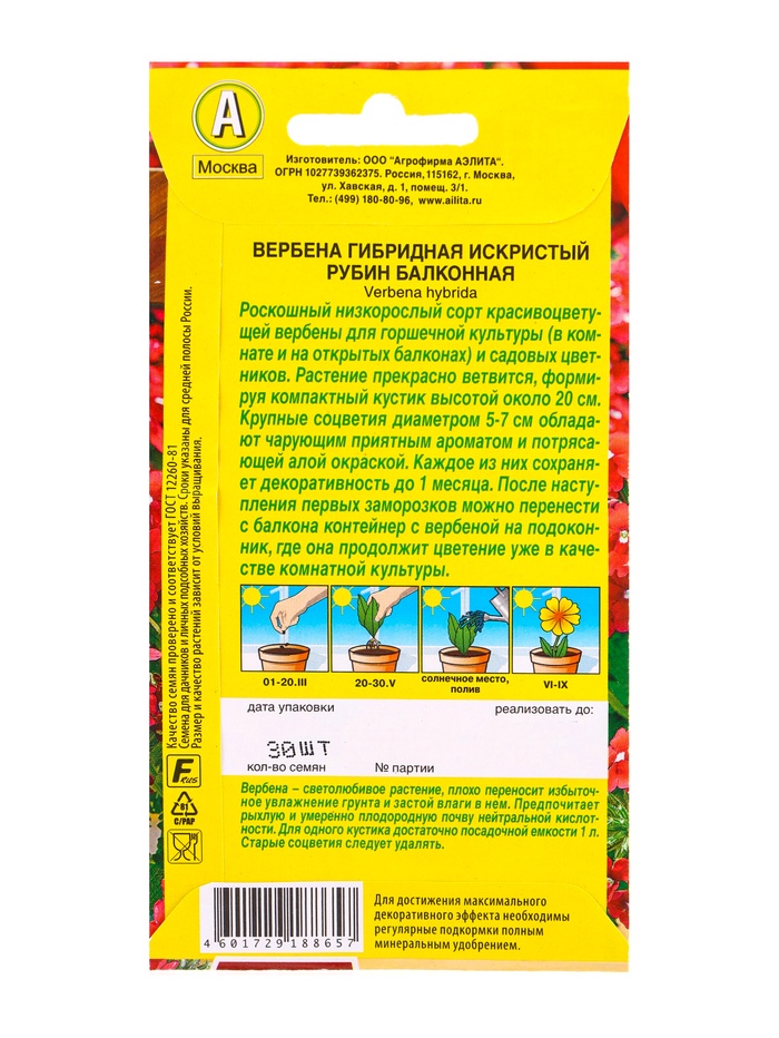 Семена цветов Вербена Искристый рубин балконная Цветущий балкон, Ц/П,30 шт. — Характеристики