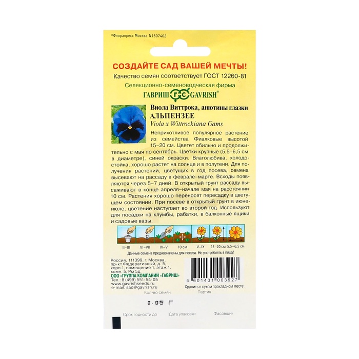 Неприхотливое популярное растение из семейства Фиалковые высотой 25-30 см. Цветет обильно и продолжительно с мая по сентябрь. Цветки крупные (5,5-6,5 см в диаметре), синей окраски. Влаголюбива, холодостойка, хорошо растет на солнце и в полутени. Для получения растений, цветущих в год посева, семена высевают на рассаду в феврале-марте. Всходы появляются через 5-7 дней. В открытый грунт рассаду высаживают в конце апреля-начале мая на расстоянии 20 см. Растения хорошо переносят пересадку в цветущем состоянии. При посеве в открытый грунт в июне-июле, цветение наступает во второй год. Используют для посадки на клумбы, рабатки, в балконные ящики и садовые вазы.