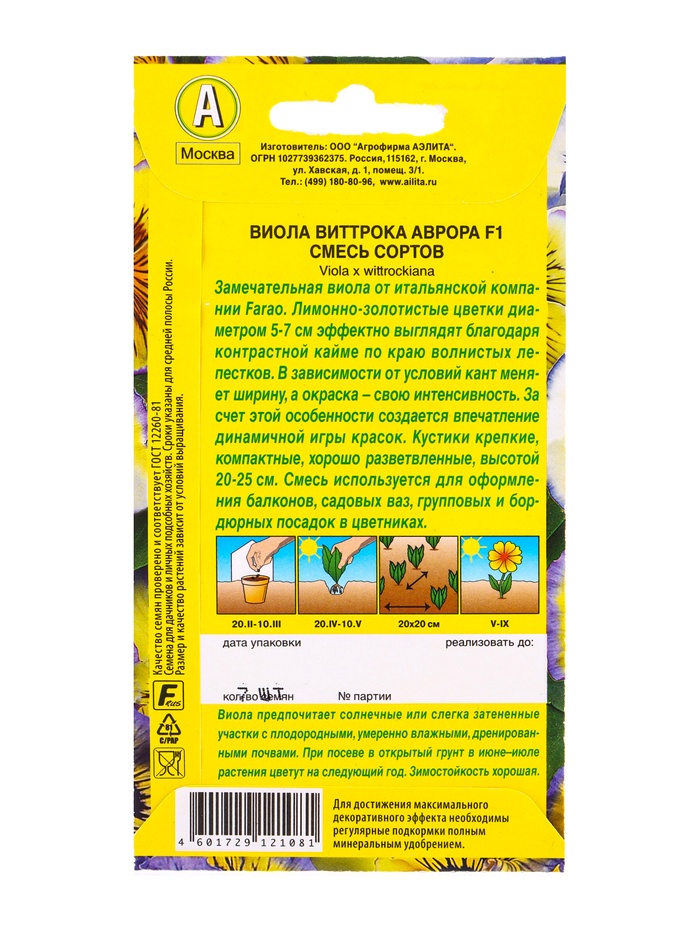 Семена цветов Виола Аврора F1, смесь сортов Дв С. Farao, Ц/П,7 шт. — Характеристики