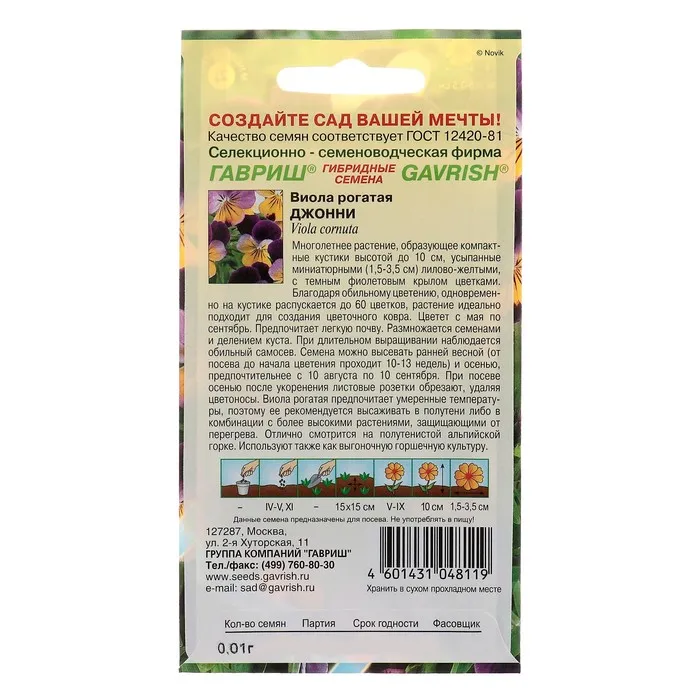 Многолетнее растение, образующее компактные кустики высотой до 10 см, усыпанные миниатюрными (1,5-3,5 см) лилово-желтыми, с темным фиолетовым крылом цветками. Благодаря обильному цветению, одновременно на кустике распускается до 60 цветков, растение идеально подходит для создания цветочного ковра. Цветет с мая по сентябрь. Предпочитает легкую почву. Размножается семенами и делением куста. При длительном выращивании наблюдается обильный самосев. Семена можно высевать ранней весной (от посева до начала цветения проходит 10-13 недель) и осенью, предпочтительнее с 10 августа по 10 сентября. При посеве осенью после укоренения листовые розетки обрезают, удаляя цветоносы. Виола рогатая предпочитает умеренные температуры, поэтому ее рекомендуется высаживать в полутени либо в комбинации с более высокими растениями, защищающими от перегрева. Отлично смотрится на полутенистой альпийской горке. Используют также как выгоночную горшечную культуру.