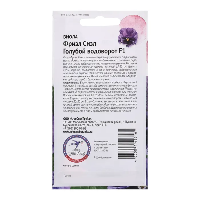 ВИОЛА ФРИЗЛ СИЗЛ ЖЕЛТО-ГОЛУБОЙ ВОДОВОРОТ F1 Серия Фризл Сизл – это многократно улучшенный гибрид виолы сорта Рококо, отличающийся необыкновенно красивыми окрасками и сильно гофрированными лепестками цветков. Растения формируют компактные кустики высотой 15-20 см. Цветки очень крупные, достигают 8 см в диаметре, гофрированные, желто-голубой окраски. Отличается ранним, обильным и продолжительным цветением. Виола идеально подходят для оформления рабаток, клумб и балконных ящиков. Агротехника: Виолу можно выращивать в одно- и двухлетней культуре. 1 способ: на рассаду семена высевают в конце февраля – начале марта, слегка присыпая легким субстратом. Посевы увлажняют из опрыскивателя и накрывают пленкой или стеклом. Всходы появляются на 14-20 день. Сеянцы необходимо притенять. В грунт рассаду высаживают в конце апреля – начале мая по схеме 20х20 см. 2 способ: семена высевают в июне-июле в открытый грунт, сильно не заглубляя. Осенью рассаду высаживают на постоянное место по схеме 20х20 см. Цветение начинается на следующий год в мае и продолжается несколько месяцев. Штрих-код - 4650091483167