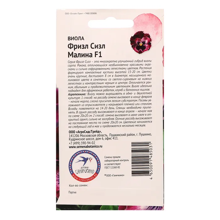 Семена цветов Виола "Фриззл Сиззл Малина", 10 шт — Характеристики