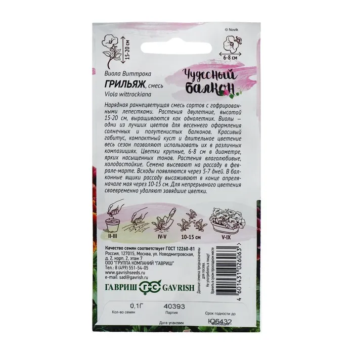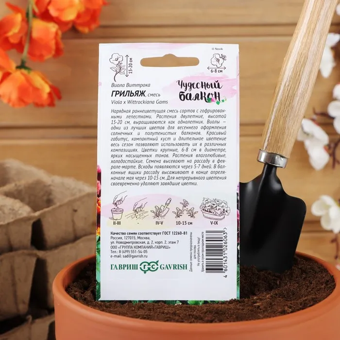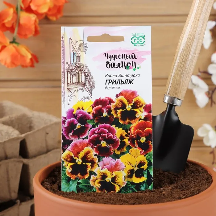 Нарядная раннецветущая смесь сортов с гофрированными лепестками. Растения двулетние, высотой 15-20 см, выращиваются как однолетник. Виолы- одни из лучших цветов для весеннего оформления солнечных и полутенистых балконов. Красивый габитус, компактный куст и длительное цветение весь сезон позволяют их использовать в различных композициях. Цветки крупные, 6-8 см в диаметре, ярких насыщенных тонов. Растения влаголюбивые, холодостойкие. Семена высевают на рассаду в феврале-марте. Всходы появляются через 5-7 дней. В балконные ящики рассаду высаживают в конце апреля-начале мая через 10-15 см. Для непрерывного цветения своевременно удаляют завядшие цветки.