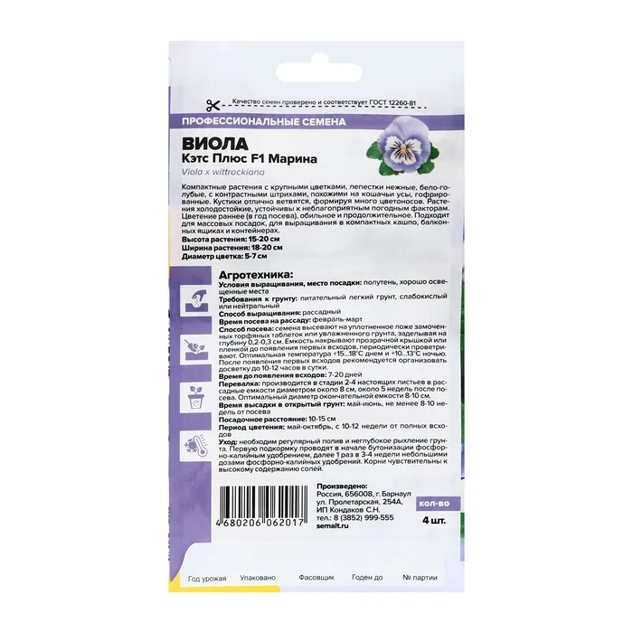 Семена цветов Виола Кэтс Плюс F1 Марина, ц/п, 4 шт. — Характеристики