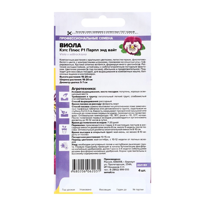 Семена цветов Виола «Кэтс Плюс - парпл энд вайт», F1, 4 шт., «Семена Алтая» — Характеристики