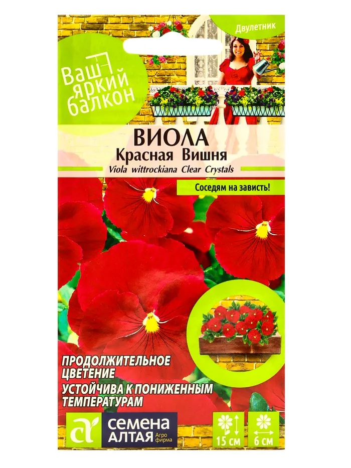 Великолепная виола, отличающаяся ранним и обильным цветением. Растение компактное, до 15 см высотой, с крупными (до 6 см диаметром) цветками винно-красной окраски. Растение отличает быстрый и стабильный рост в различных условиях выращивания, неприхотливость, зимостойкость. Отлично подходит для оформления клумб, бордюров, вазонов, каменистых горок, используется для озеленения балконов. Неприхотливое, зимостойкое растение, предпочитает открытые солнечные участки, но может расти в полутени. Хорошо развивается на почвах, состоящих из торфа, перегноя и дерновой земли с добавлением песка. При выращивании как двулетника, семена на рассаду высевают в мае-июле на разводочные гряды. В конце августа - начале сентября подросшие сеянцы высаживают на постоянное место. Для получения растений, цветущих в год посева, семена на рассаду высевают с последней декады февраля. В субстрате делают бороздки глубиной 3-5 мм, интервал между бороздками - 1 см. Семена раскладывают с интервалом 2 см и присыпают почвой. Посевы увлажняют, накрывают стеклом и помещают в тёплое светлое место с температурой +20-25оС. Стекло периодически снимают для проветривания. Всходы появляются через 7-10 дней. В первые дни проводят проветривания 2 раза в сутки по 20-30 минут, постепенно увеличивая временной интервал, полностью укрытие снимают через неделю. При образовании двух настоящих листиков проводят пикировку. В открытый грунт рассаду высаживают в конце мая - июне. Посадочный интервал 15-20 см. Цветение при выращивании рассадой с июля до заморозков, при посеве семян в грунт – на следующий год с ранней весны и до поздней осени.